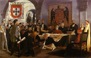 Portugueses e espanhóis percorreram mares e conquistaram terras onde já viviam outras pessoas. Não reconheceram, porém, os direitos desses povos e  resolveram dividir entre si as terras descobertas e por descobrir. Em 1494, assinaram o Tratado de Tordesilhas. Esse tratado traçava uma linha imaginária que dividia o mundo entre Portugal e Espanha. Foi nesse panorama de viagens e conquistas que, em 22 de abril de 1500, chegou ao Brasil o navegante português Pedro Álvares Cabral e sua esquadra.